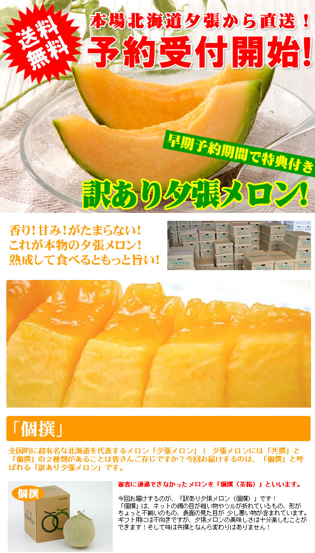 | 【商品内訳】 | 訳あり夕張メロン(個撰)2~2.5kg箱(1~2玉) ※範囲内の玉数のご指定は出来ません。 |